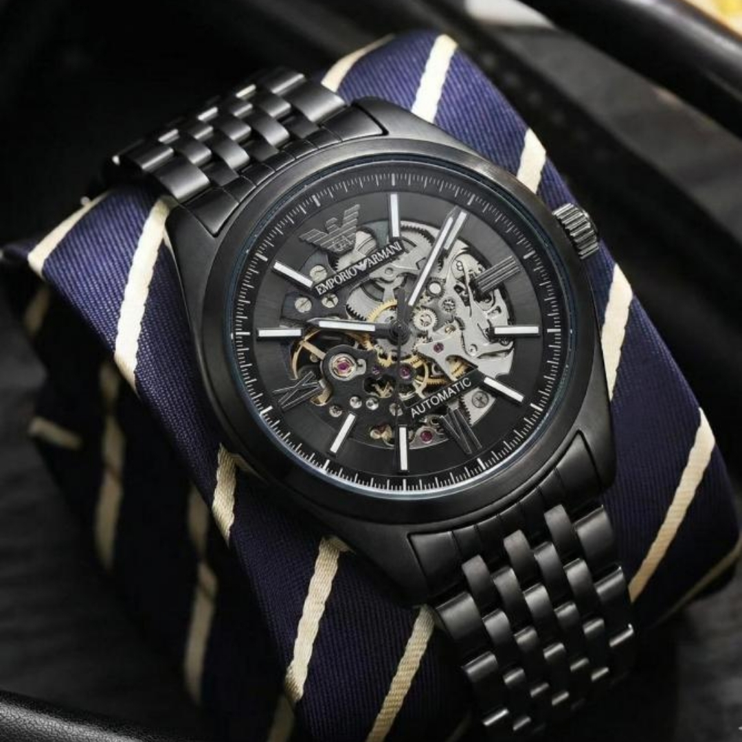 The Emporio Armani Automatic Black Skeleton Dial Watch is a perfect blend of modern luxury and mechanical craftsmanship. Designed for men who appreciate fine detailing, this timepiece features a striking black skeleton dial that reveals the intricate automatic movement inside.