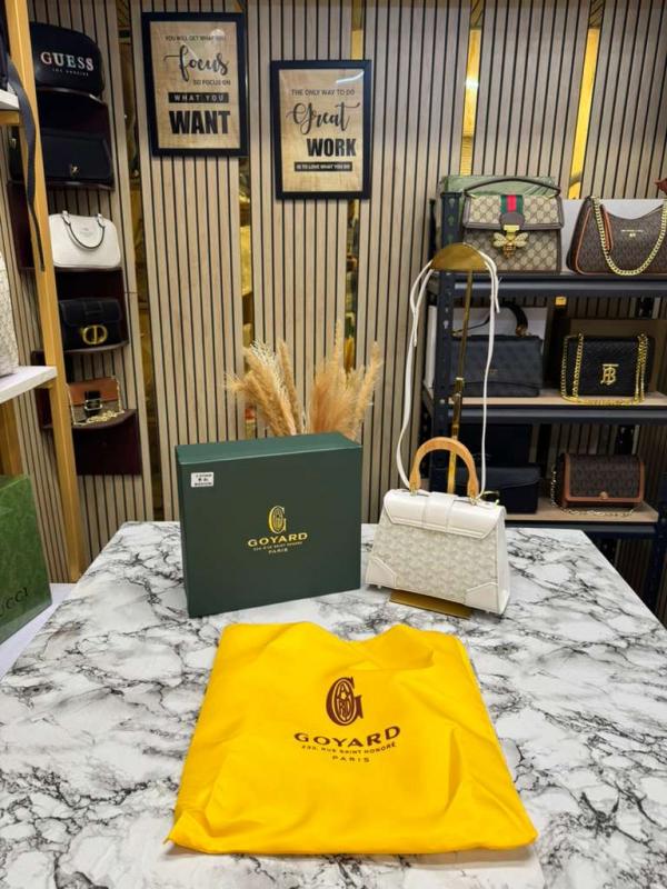 The bag features the signature Goyard-inspired canvas pattern that gives it a distinctive and luxurious appearance. The stylish white color adds a fresh and elegant touch, making it suitable for both casual outings and special occasions.