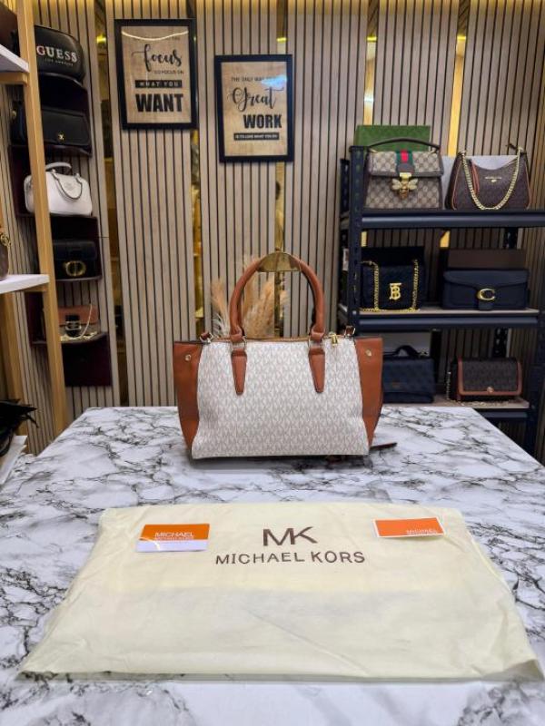 Michael Kors Laila Satchel Bag (Beige) with Dust Bag | Premium Designer Structured Handbag for Women.
